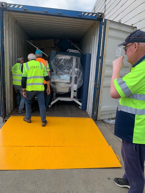 This initiated a few visits to the Rotary Donations In Kind (DIK) warehouse, and identifying what equipment was available and require, Rotary Yarraville sponsored the project. Through the wide Rotary network we were able to fill a shipping container with vital second-hand medical equipment — including wheelchairs, crutches, electric beds, patient trolley, walkers, a neonatal cot & phototherapy, IV poles, blood pressure monitors, microscope, medical consumables, patient clothing, and more.